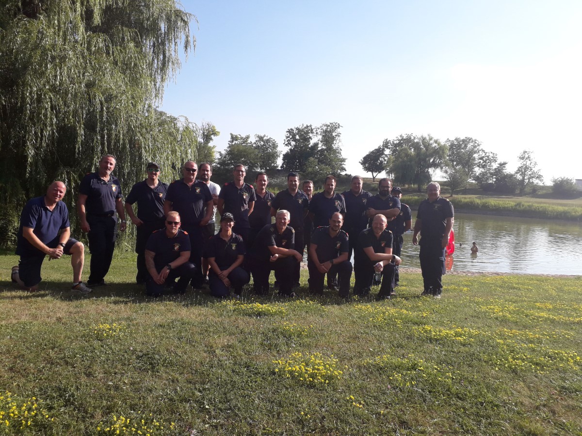 -) Bereisung der Teiche durch die örtliche Feuerwehr und den Feuerwehren mit Wasserfahrzeugen am 29.07.2021 mit 19 Mitgliedern. Ziel der Bereisung: Anfahrtswege, Lotsenpunkte durch örtliche Feuerwehr festlegen, Feststellung der Größenverhältnisse und Tiefen der Teiche.